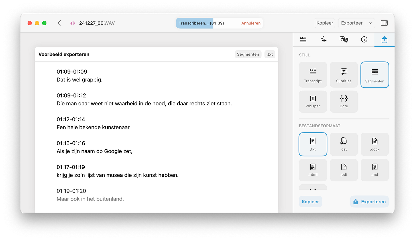 Zoals je in het screenshot kunt zien heeft MacWhisper niet echt beste oren. Het blijft zonder meer opvallend hoe slecht AI eigenlijk kan luisteren. Laat je een mens van vlees en bloed transcriberen dan krijg je een veel beter transcript. Echter, niet zo snel als MacWhisper dat kan. En hou die opmerking even vast want als het gaat om AI dan gaat het meestal niet om de Kwaliteit maar om de Kwantiteit, om de snelheid namelijk waarmee de AI-tool iets doet.