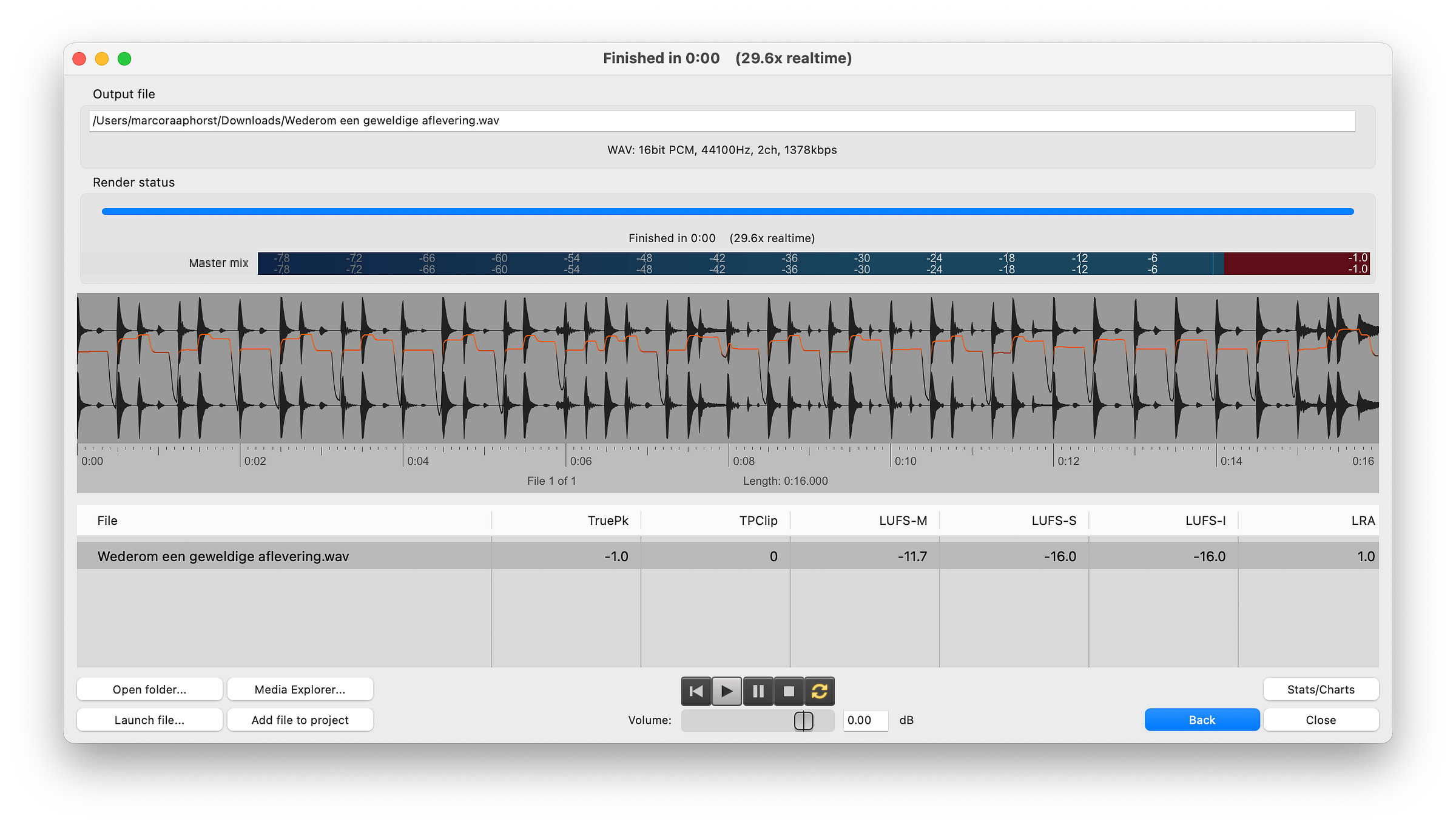 Voeg een Limiter toe aan de masterbus en stel hem zo af dat hij tijdens de export precies op -16 LUFS uitkomt. Dat vraagt om een beetje trial en error.