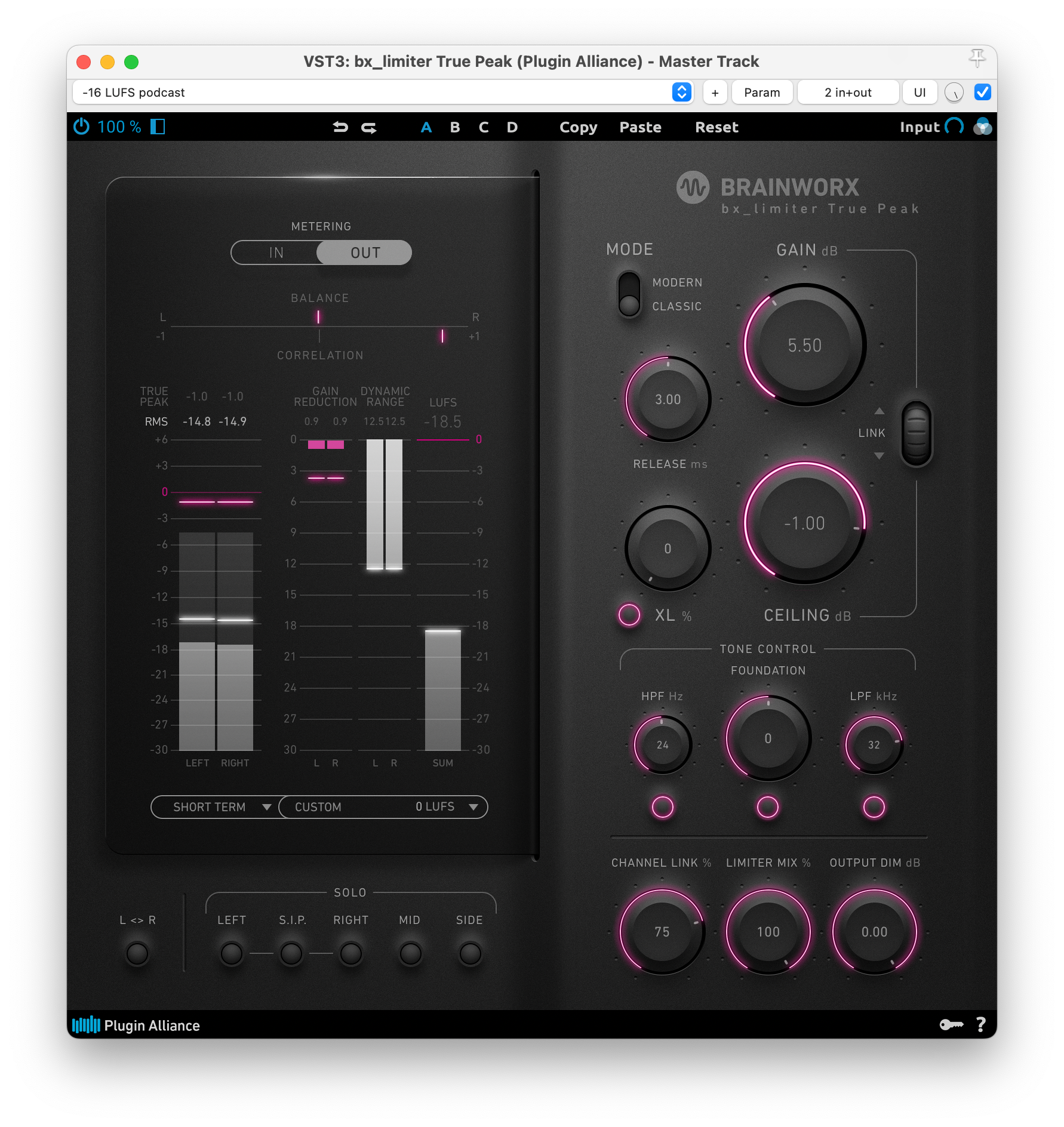 Wanneer je een export maakt zul je waarschijnlijk zien hoe hard die export is (een goeie DAW zoals Reaper geeft je die info). En zit je dan iets te laag of te hoog dan stel je de limiter bij. In mijn ervaring heb je na een paar exports de juiste stand gevonden voor je podcast. En vrijwel alle podcasts die ik maak hebben een paar revisies nodig, dus dat is allemaal geen probleem, als het tijd is om de MASTER te maken dan zit ik meestal precies goed qua luidheid.