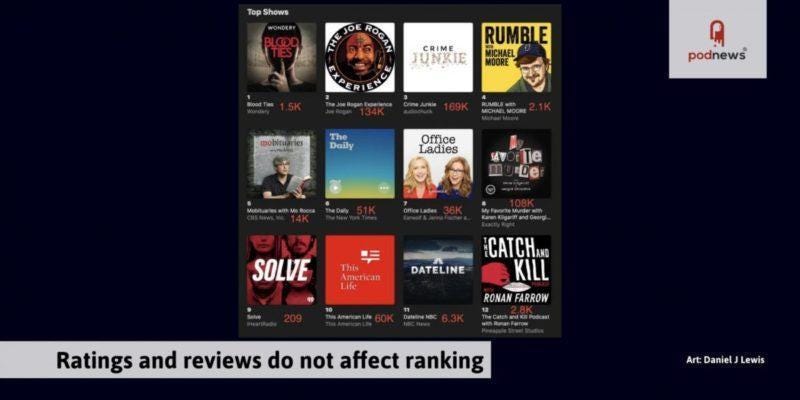 Ratings and reviews do not affect ranking in Apple Podcasts. That’s the analysis of Daniel J Lewis from My Podcast Reviews, who posts the above graphic, saying:
